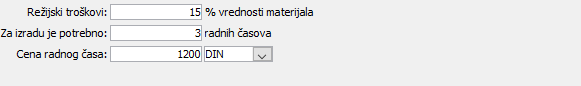Polje "Režijski troškovi:" - unesite procenat koji predstavlja realan finansijski iznos režijskih troškova koji se izračunavaju na osnovu ukupne cene repromaterijala potrebnog za izradu proizvoda.