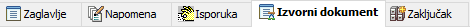Listić "Izvorni dokument" u njemu se vide podaci iz prodajnog dokumenta ukoliko je radni nalog nastao iz njega i to: broju zahteva na osnovu koga je kreiran radni nalog, kupac, adresa kupca, adresa isporuke, način i rok isporuke