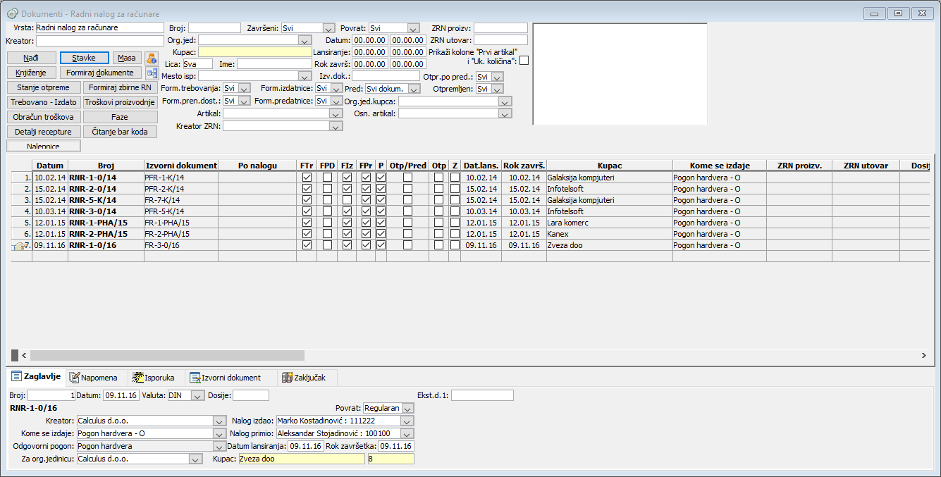 Polje "Kupac:" - izlistavaju se radni nalozi navedenog kupca. Podržan je višestruki filter;