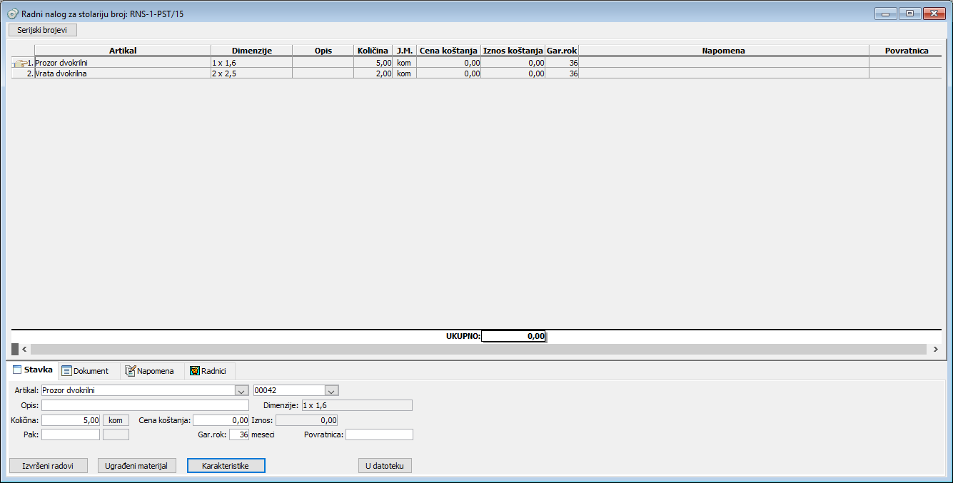 Izborom (selektovanjem) pojedinog radnog naloga moguće je pregledati stavke tog radnog naloga i kreiranu dokumentaciju. Moguće je otvoriti radni nalog i napraviti izmene ukoliko je to potrebno. Ulaskom u stavke radnog naloga otvara se prozor za njihovo unošenje i obradu ( vidi sliku )