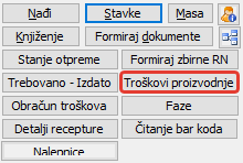 Dugme "Troškovi proizvodnje" - klikom na ovo dugme otvara se prozor "Troškovi proizvodnje" za definisanje direktnih i indirektnih vrsta troškova proizvodnje nastalih tokom realizacije radnih naloga.