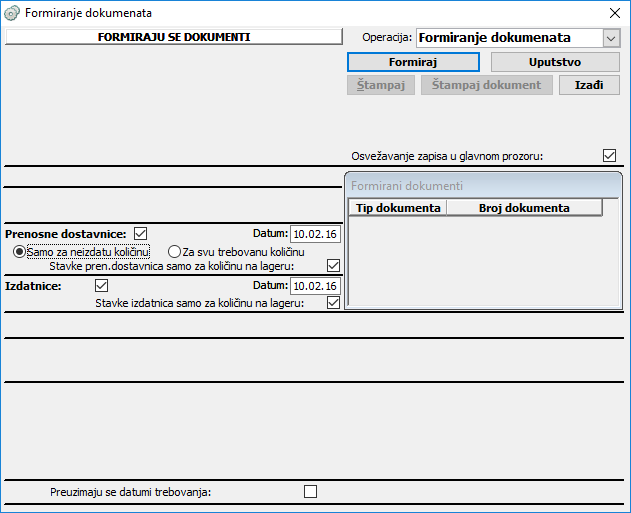 Dugme "Formiraj izdatnice i pren. dostavnice"