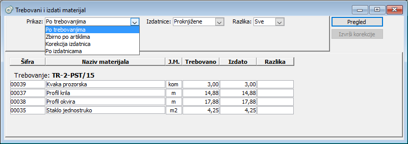 U prozoru "Trebovani i izdati materijal" vide se razlike između trebovanog i izdatog materijala koje se mogu korigovati. Više o ovome pročitajte u delu uputstva Razlika trebovanih i izdatih količina materijala.