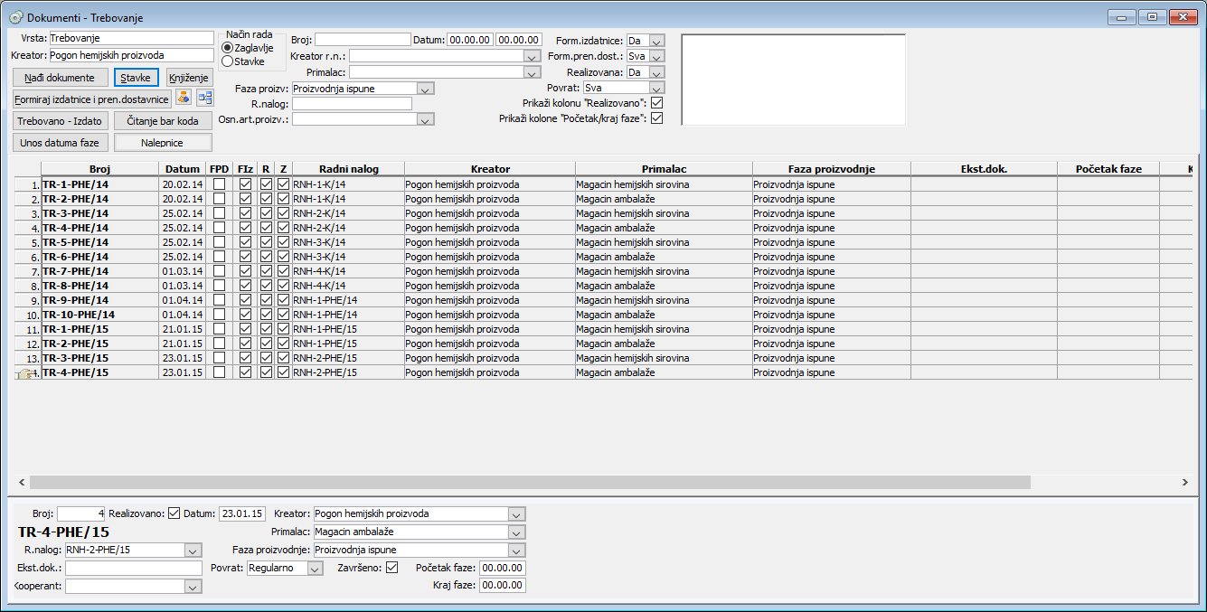 Polje "Faza proizv.:" - iz padajuće liste ovog polja selektujte fazu proizvodnje za koju se realizuje trebovanje.