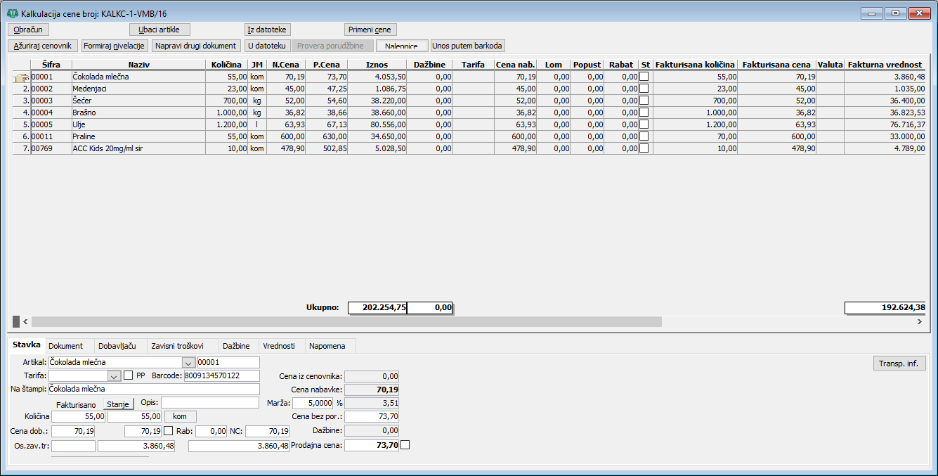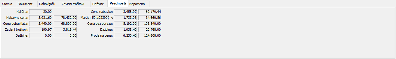 Listić "Vrednosti" - služi za prikaz vrednosti sledećih podataka: Količina; "Nabavna cena"; "Cena dobavljača" - prikazuje se pojedinačna i zbirna cena; "Zavisni troškovi" - po jedinačni i ukupni; "Dažbine" - preneti porez pojedinačno i zbirno; "Cena nabavke" - pojedinačna i ukupna; "Marža" - procentualni prikaz kao i prikaz po jedinici artikla i zbirni prikaz; "Cena bez poreza" - pojedinačna i ukupna; "Dažbine" - obračunate na prodajnu cenu pojedinačno i zbirno; "Prodajna cena" - po jedinici mere i ukupna.