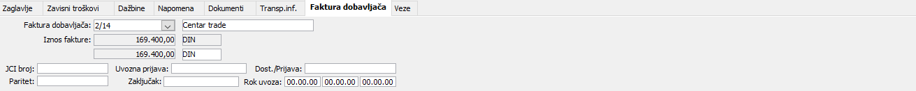 Listić Faktura dobavljača - služi za unos polja koja bliže određuju fakturu dobavljača