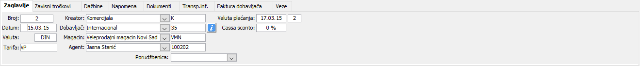 Izbor za polja valuta, kreator, dobavljač, magacin i porudžbenica olakšan je postojanjem drop-down (padajućih) lista.