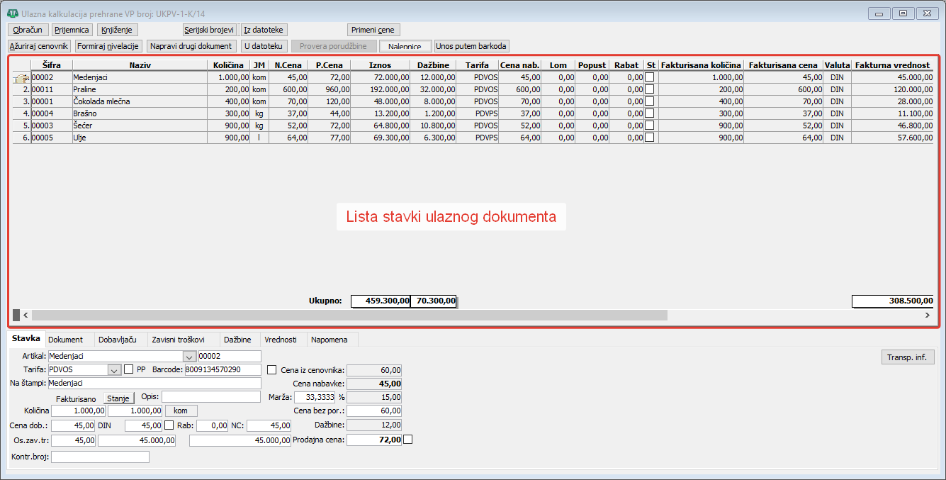 U središnjem (drugom) delu prozora za prikaz stavki ulaznog dokumenta izlistane su stavke dokumenta ( vidi sliku )