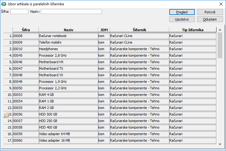 Klikom na dugme za izbor artikla iz paralelnih šifarnika