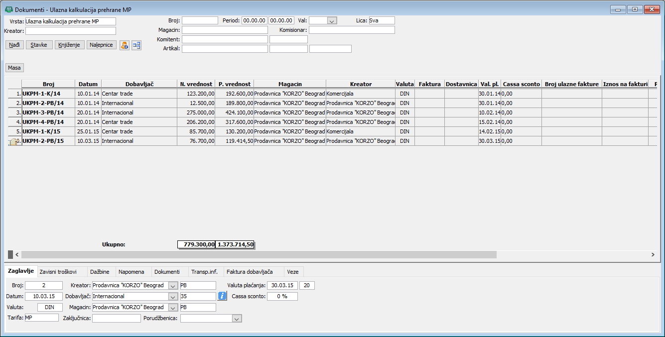 - Ostala polja se izračunavaju - Cassa sconto; Preneti porez; Nabavna cena; Vrednost dobavljaču; Vrednost rabata; Vrednost popusta; Vrednost loma; Vrednost Cassa sconta; Vrednost prenetog poreza; Nabavna vrednost.