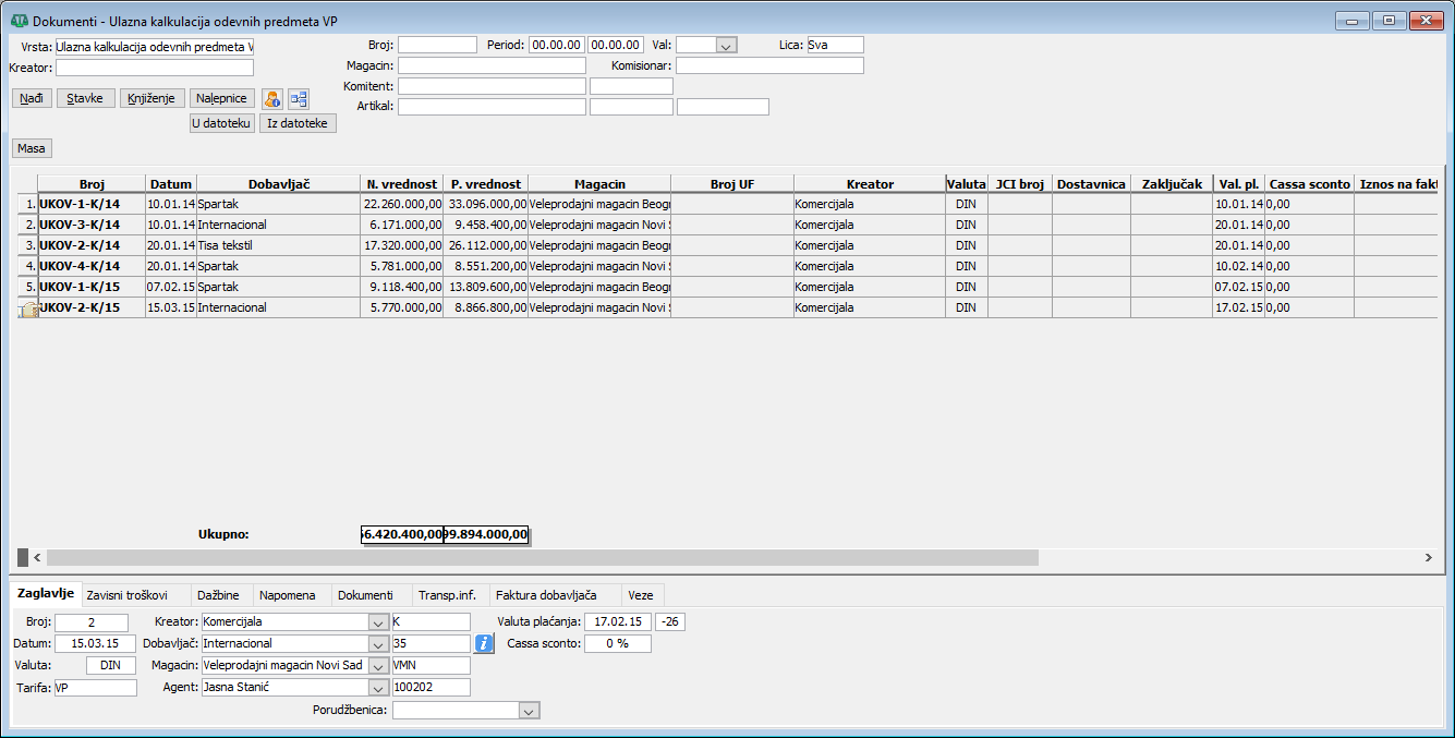 (dokumenta, stavke dokumenata) koji zadovoljavaju kriterijum pretage, ili ukoliko kriterijum nije naveden, pregled svih dokumenata određene vrste za koju želimo pregled. Ovde je takođe omogućeno unošenje novih i brisanje postojećih dokumenata ili stavki dokumenata.