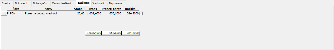 - "Dažbine:" - iznos obračunatog PDV-a prema PDV stopi unetoj u polje Tarifa.