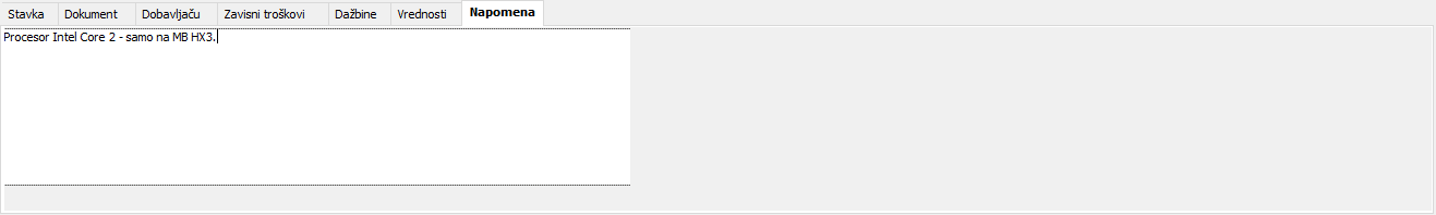 Listić "Napomena" - ovo je polje u kome se može navesti napomena kojom se šire opisuje sve ono što se odnosi na stavku ulaznog dokumenta.