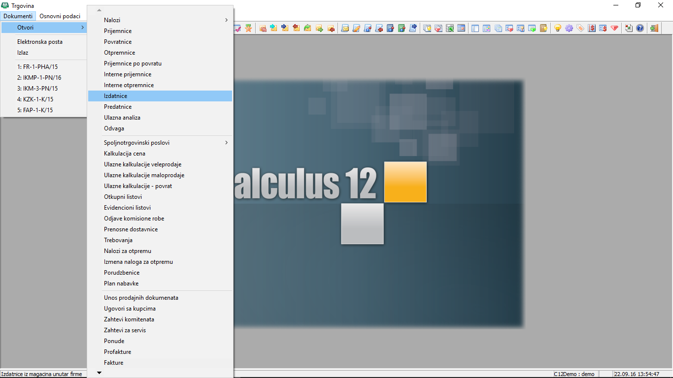 Da otvorite prozor "Dokumenti - Izdatnica" u glavnom meniju programa "Trgovina" odaberite stavku "Dokumenti - Otvori - Izdatnice" ( vidi sliku )