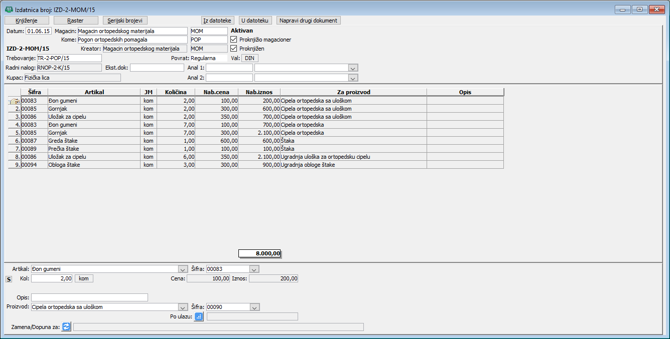 Klikom na dugme " Stavke " otvara se prozor za unos stavki dokumenta u kome se unose: artikal, količina, opis i proizvod koji nastaje od datog materijala ( ukoliko se izdaje materijal za proizvodnju ). Polje cena se popunjava iz polja za nabavnu cenu artikla u određenom magacinu, a polje jedinica mere iz podataka o samom artiklu.