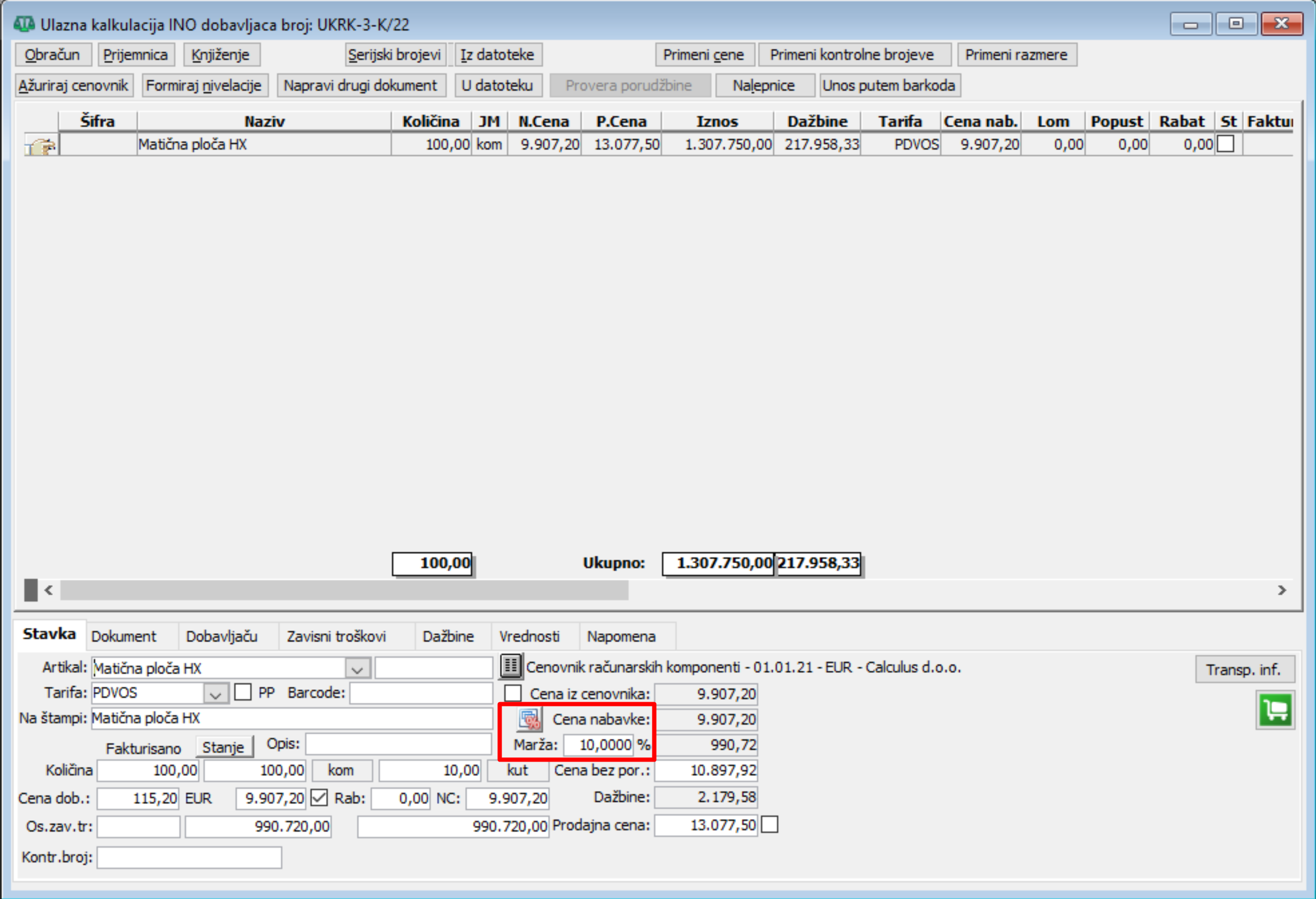Ulazna kalkulacija - stavka 1 red