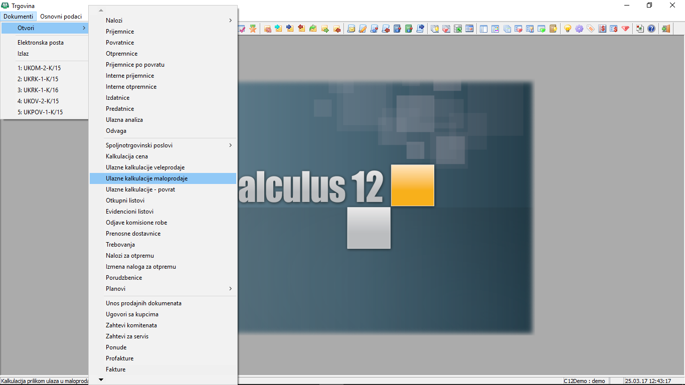 ili kliknite na ikonu osnovnog menija "Ulazne kalkulacije maloprodaje"
