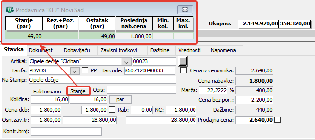 Klikom na dugme za pregled stanja na zalihama