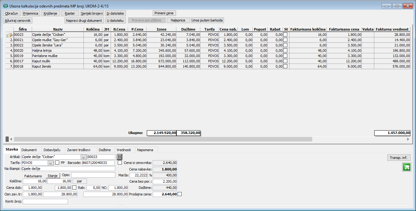 Stavke ulazne kalkulacije veleprodaje
