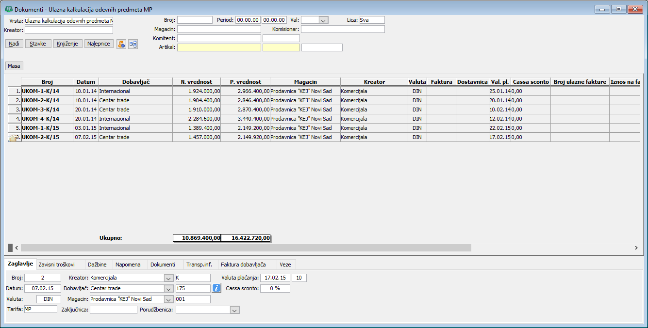 Neproknjiženi dokumenti: Ulazna kalkulacija maloprodaje