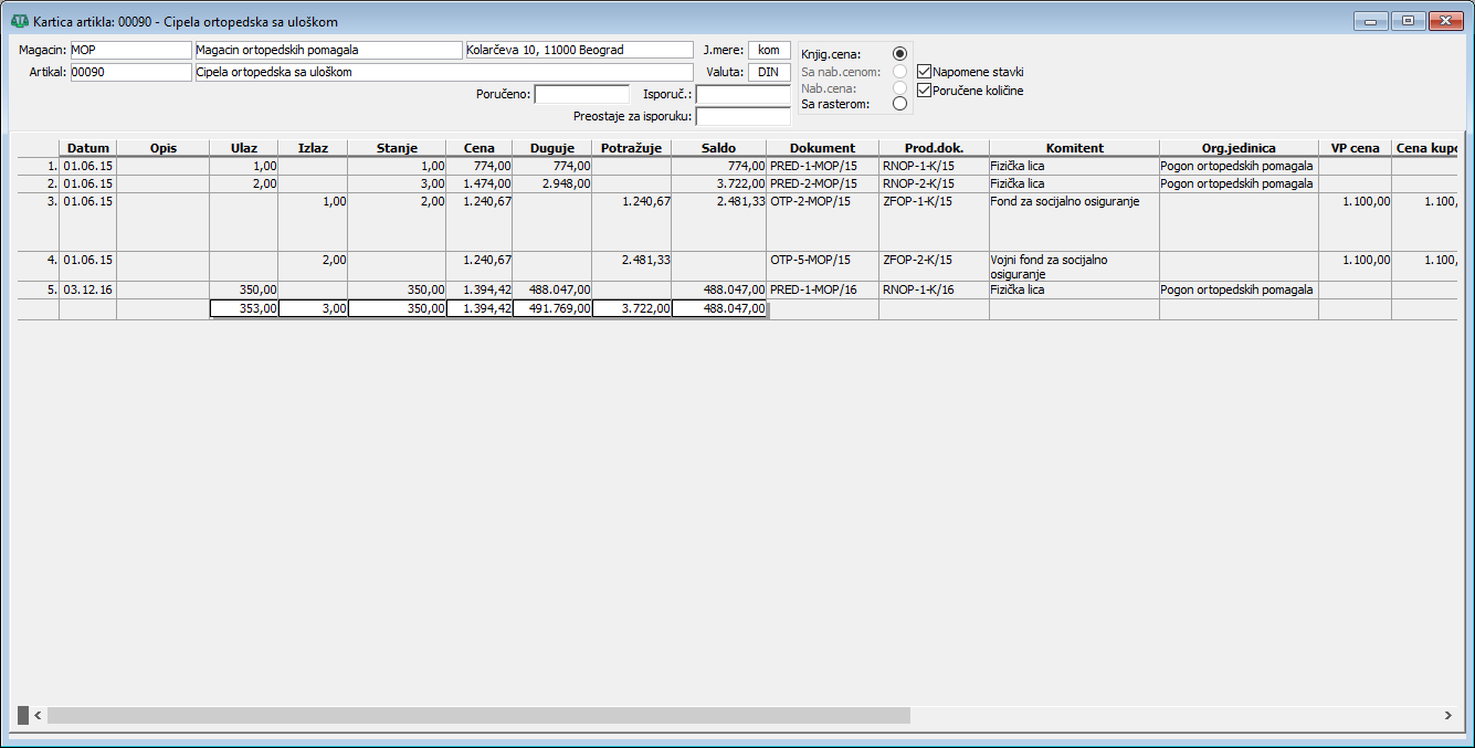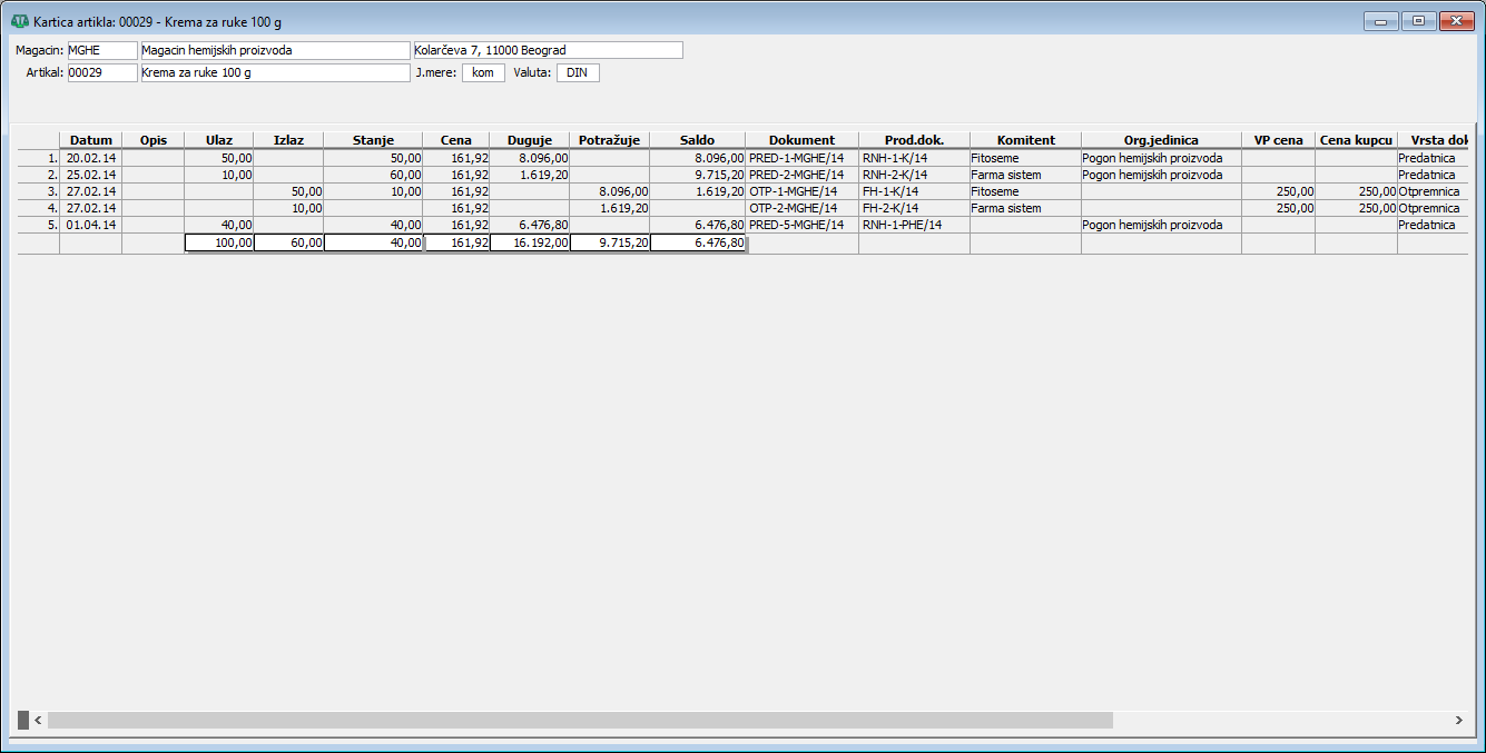 Klikom na dugme "Kartica" ulazi se u dokumente u čijim stavkama se nalazi određeni artikal. Ovaj prozor se može aktivirati samo ukoliko je čekirana opcija "Po magacinima", ili ukoliko je dobijen pregled za određeni magacin.