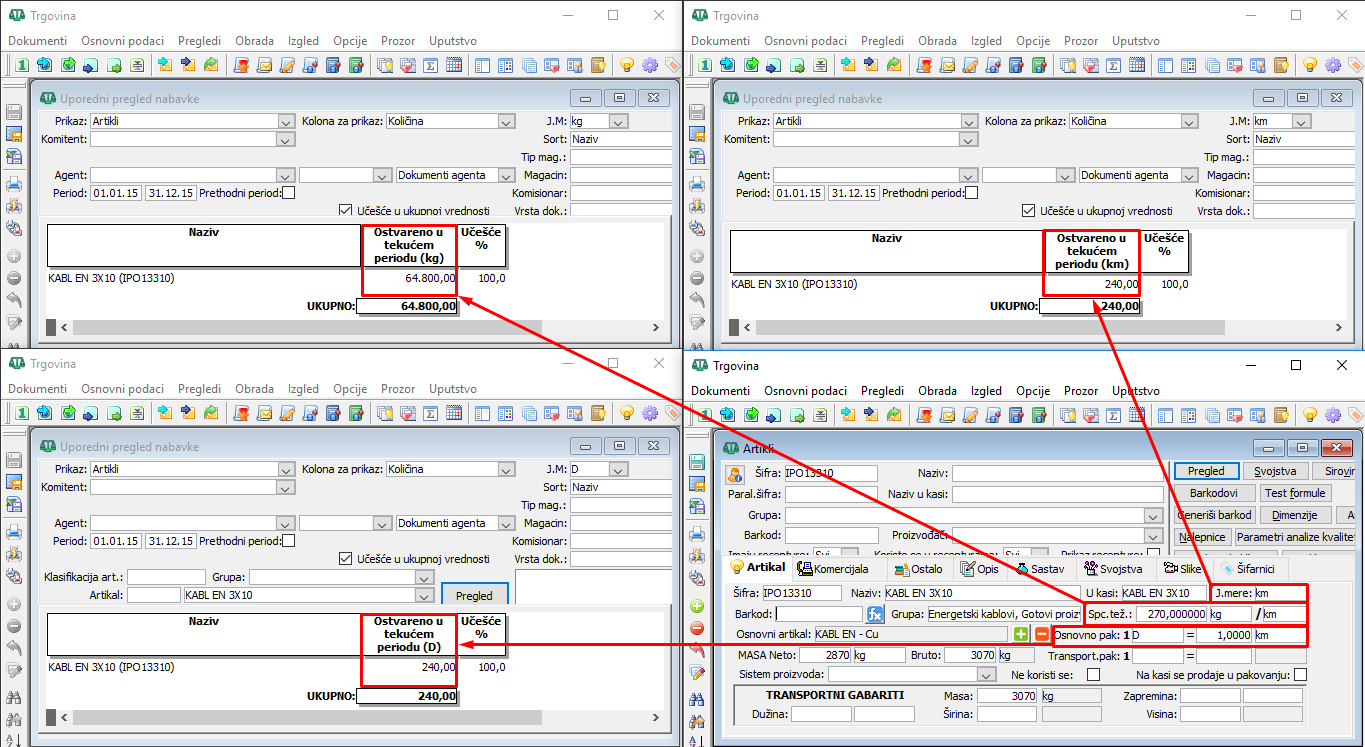 Čisto analitike radi, pretpostavimo da sektor nabavke nabavlja kablove od proizvođača u kilometrima. Prenosom u veleprodaju, sektor veleprodaje prati nabavku u dobošima dok pojedinačni maloprodajni objekti prate nabavku svih kablova u metrima. Iz menadžmenta maloprodaje zahteva se uporedni pregled nabavke artikla KABL EN 3X10 za period 01.01.2024 do 31.12.2024. godine u metrima.