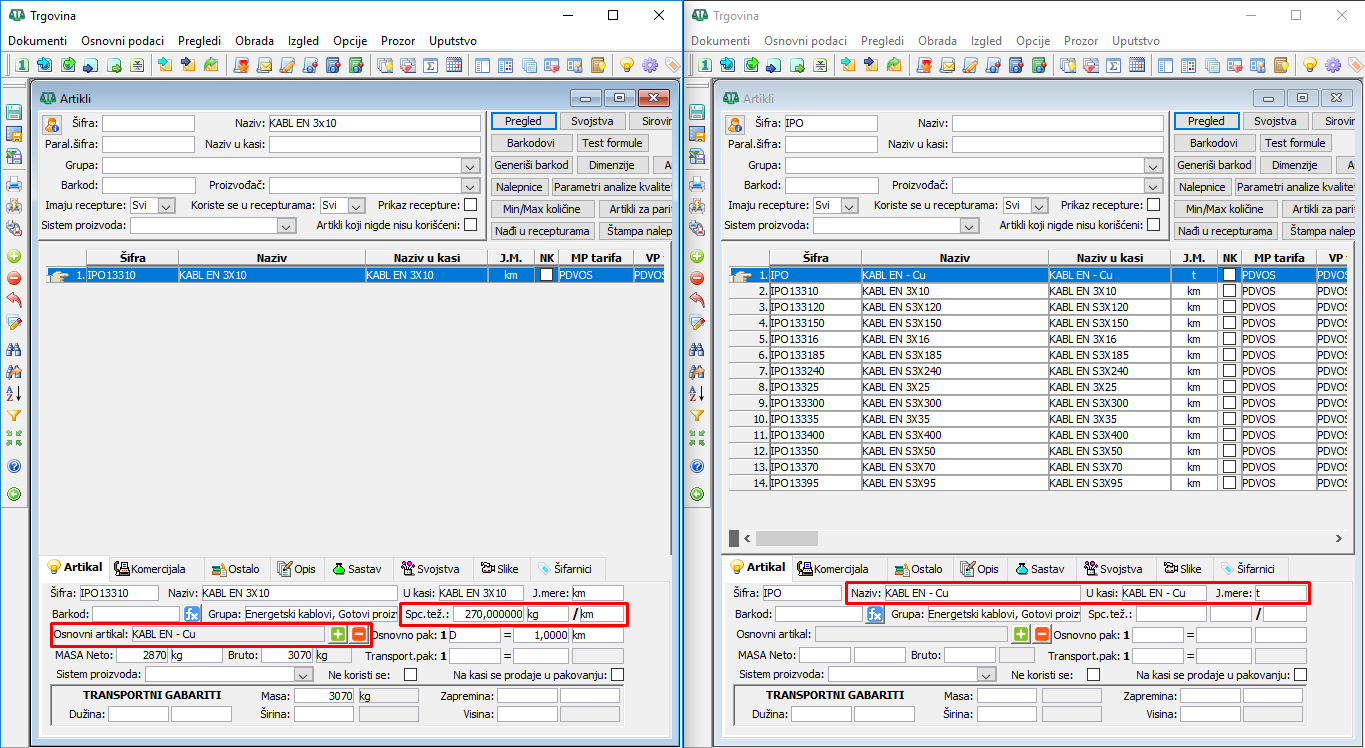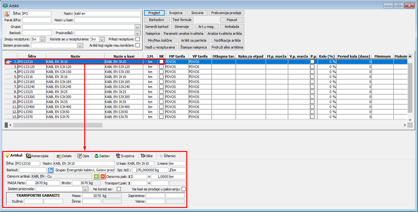Iz tabele proizvođača kablova možemo definisati u artiklima podatke za svaki od nabavljenih kablova - šifru, naziv, jedinicu mere (km), spacifičnu težinu (kg/km) i pakovanje, ( vidi sliku )