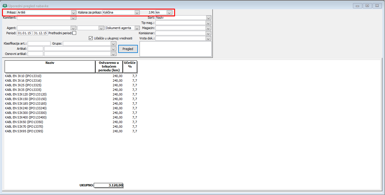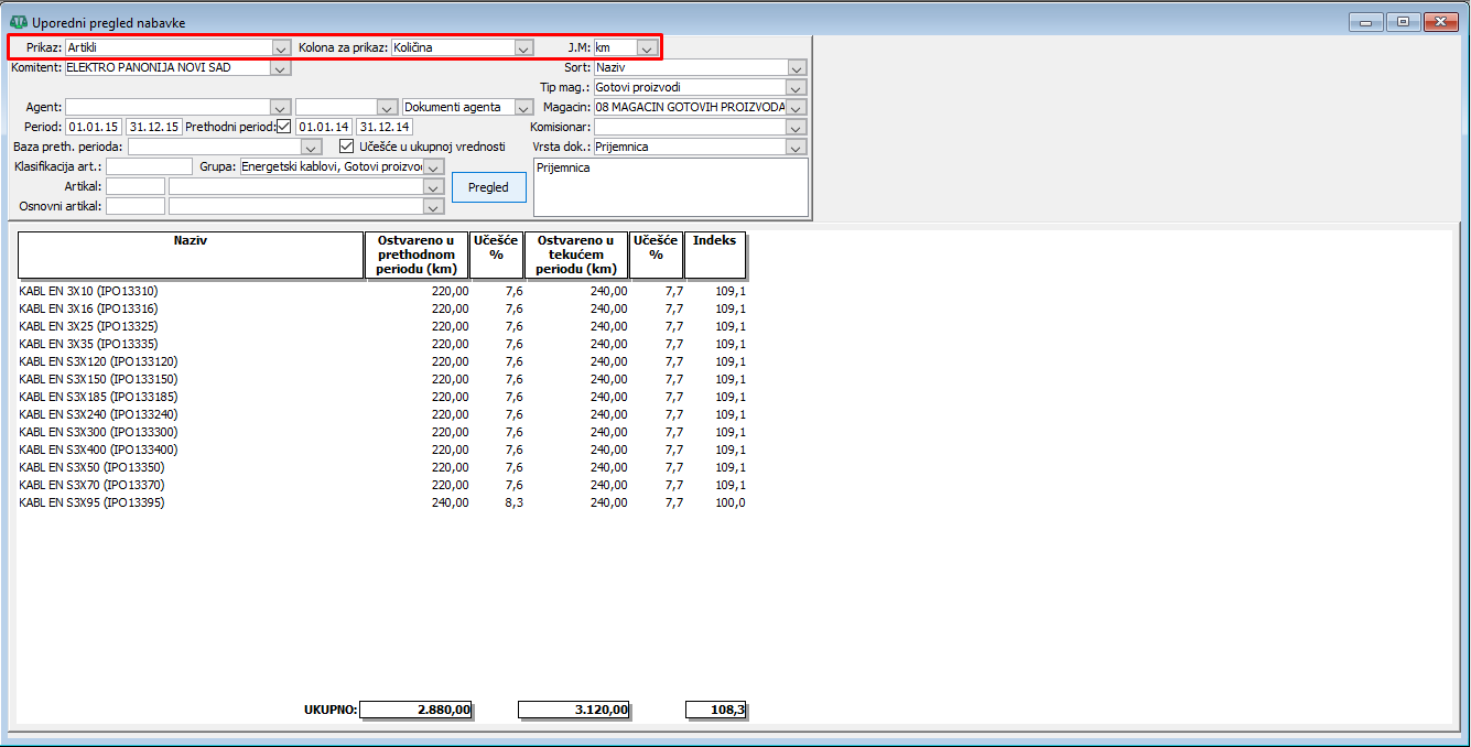 Uporednog pregleda nabavke za prikaz po artiklima kada je izabrana kolona za prikaz "količina" i jedinica mere kilometar za period od 01.01.2024 do 31.12.2024. godine i prethodni period od 01.01.2014 do 31.12.2014. godine.