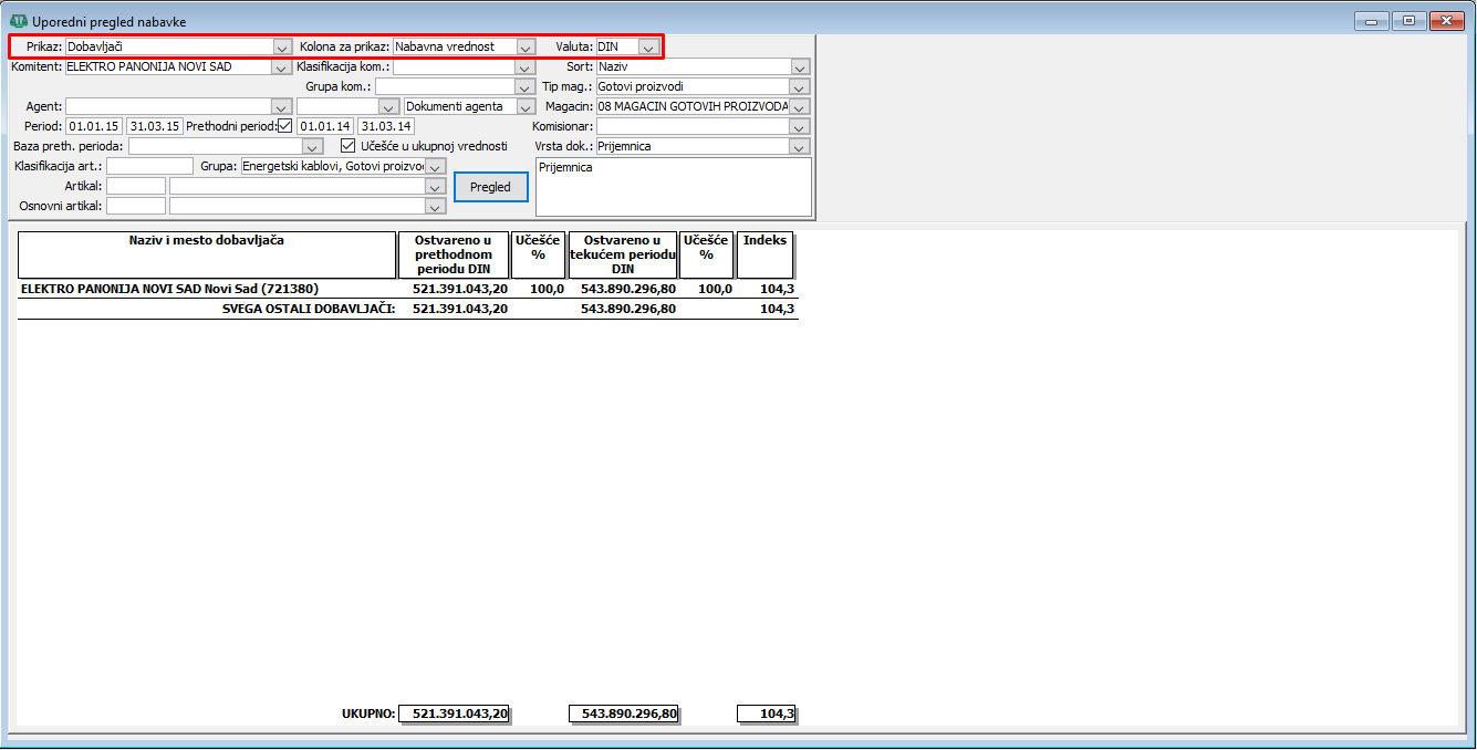 Za uporedni pregled nabavke po dobavljačima za prvi kvartal 01.01.2024 do 31.03.2024. godine i prethodni kvartalni period od 01.01.2014 do 31.03.2014. godine postavite prikaz na "Dobavljači" i obavezno kao kolone za prikaz izaberite "Nabavna vrednost", ( vidi sliku )