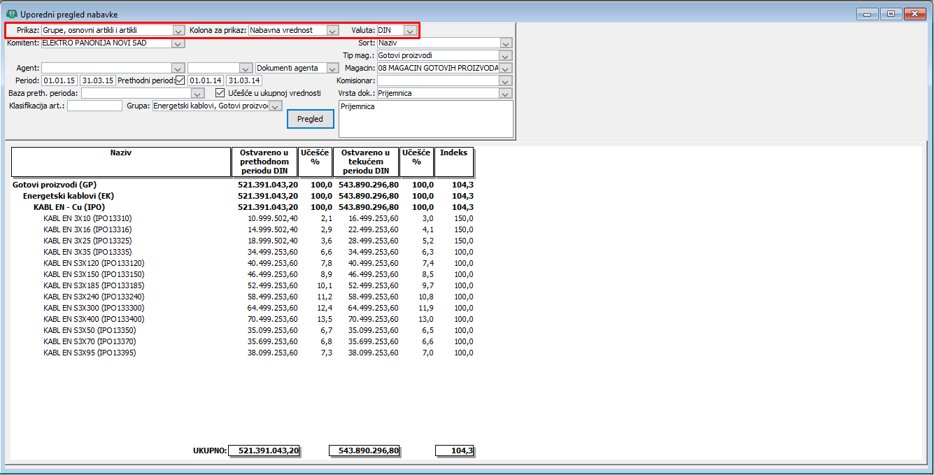 Uporedni pregled nabavke za prvi kvartal 01.01.2024 do 31.03.2024. godine i prethodni kvartalni period od 01.01.2014 do 31.03.2014. godine za prikaz po grupama, osnovnim artiklima i artiklima je samo još jedan u nizu prikaza koji se mogu birati iz padajuće liste polja "Prikaz:", ( vidi sliku )