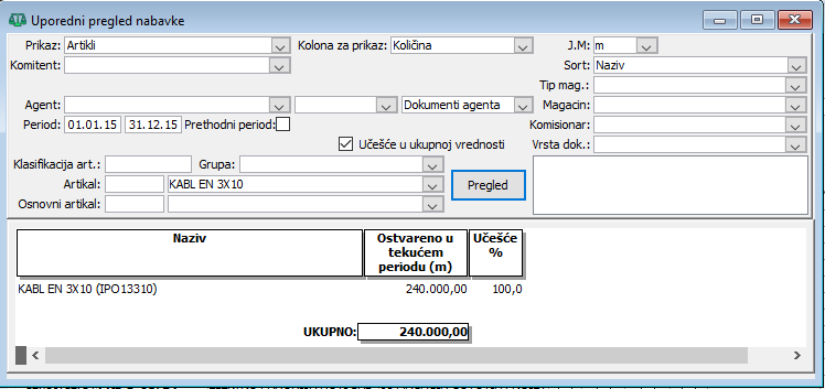 Sada možemo generisati izveštaj pregleda nabavke artikla KABL EN 3X10 za period 01.01.2024 do 31.12.2024. godine u metrima, ( vidi sliku )
