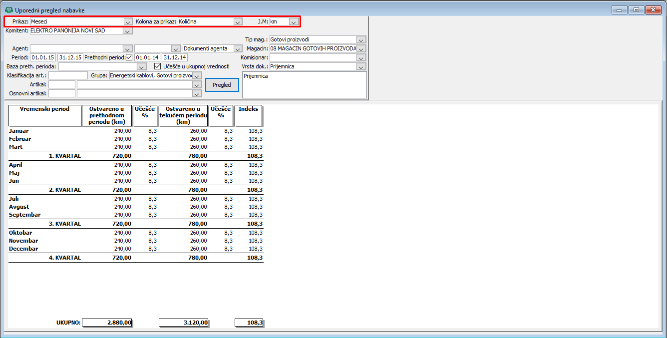 Za uporedni pregled nabavke po mesecima za period od 01.01.2024 do 31.12.2024. godine i prethodni period od 01.01.2014 do 31.12.2014. godine, postavite prikaz na "Meseci". U ovom primeru prikazan je uporedni pregled nabavke za komitenta "ELEKTRO PANONIJA NOVI SAD" i grupu proizvoda "Energetski kablovi" što znači da je uključen u izveštaj promet svih vrsta energetskih kablova koje se nabavljaju od ovog dobavljača, ( vidi sliku )