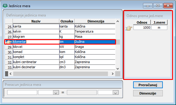 Više o načinu definisanja odnosa jedinica mera pročitajte u delu uputstva Jedinice mera.