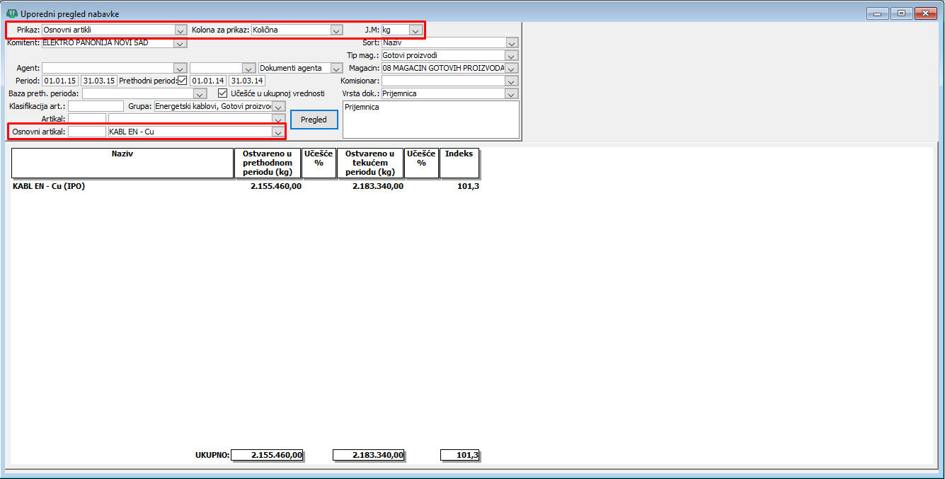 Za uporedni pregled nabavke za težinu bakra u nabavljenim kablovima za prvi kvartal 01.01.2024 do 31.03.2024. godine i prethodni kvartalni period od 01.01.2014 do 31.03.2014. godine možete postaviti prikaz po osnovnim artiklima, za kolonu za prikaz količinu i za jedinicu mere kg, ( vidi sliku )