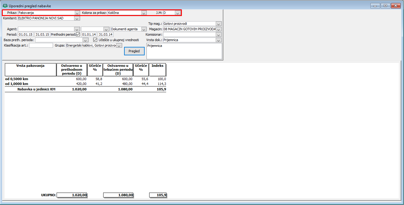 Za uporedni pregled nabavke po pakovanjima za prvi kvartal 01.01.2024 do 31.03.2024. godine i prethodni kvartalni period od 01.01.2014 do 31.03.2014. godine možete postaviti prikaz po pakovanjima, za kolonu za prikaz količinu i odgovarajuću jedinicu mere, ( vidi sliku )