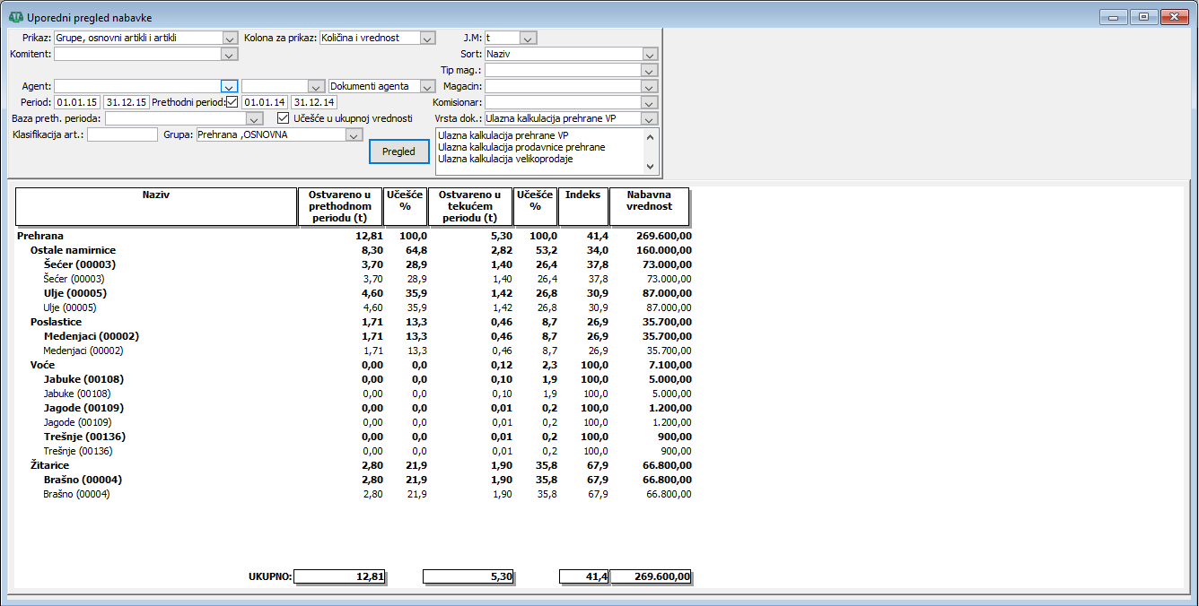 Nazivi artikala, grupa i podgrupa i pakovanja se prikazuju u krajnjoj levoj koloni sa podacima prikazanim u redovima. Zatim slede kolone sa prikazom količina ili vrednosti za ostvarenu nabavku u prethodnom periodu, indeks i procenat učešća. Zbirovi su prikazani u poslednjem redu prozora "Uporedni pregled nabavke".