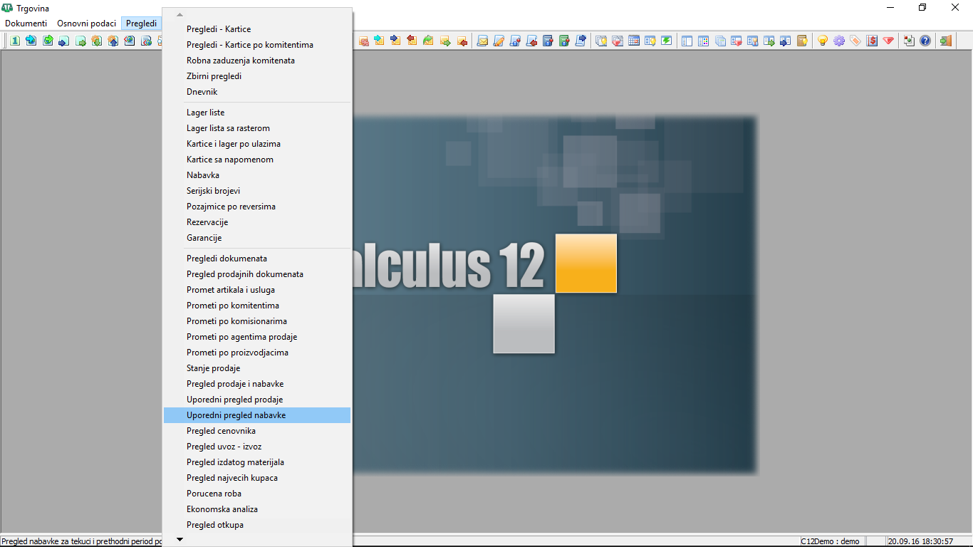 Da otvorite prozor "Pregledi - Uporedni pregled nabavke" u glavnom meniju programa "Trgovina" odaberite stavku "Pregledi - Uporedni pregled nabavke" ( vidi sliku )