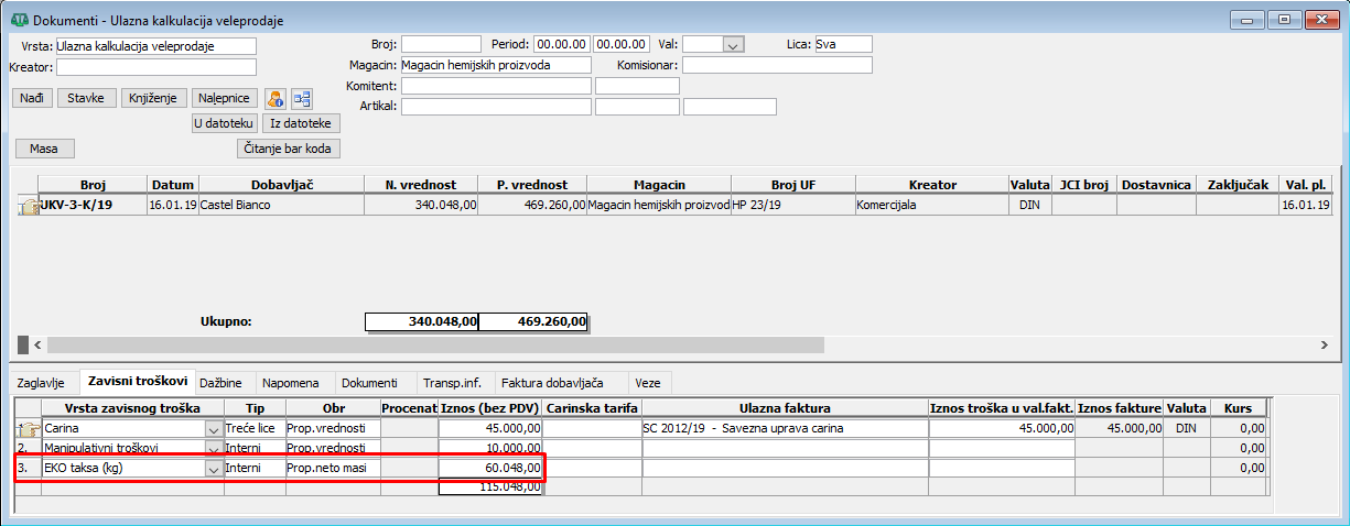 Nakon ovoga treba u stavkama UK obavezno startovati obračun radi rasporeda zavisnih troškova. Prilikom puštanja obračuna zavisnog troška po stavkama, prirodno je da u koloni "Obr" bude uneto "Prop.vrednosti". Ovaj zavisni trošak će se pri obračunu rasporediti samo na stavke čiji artikli imaju definisanu eko taksu koja je navedena u koloni "eko taksa" u definiciji vrste zavisnog troška, (vidi sliku)