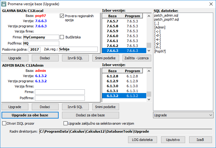 U programu “Upgrade baze” sada se koristi dbisql.com (ISQL koji se izvršava iz komandne linije). Ukoliko dođe do greške u izvršavanju nekog SQL-a ili upgrade-a, ne može da se prikaže obaveštenje o grešci i dozvoli korisniku da nastavi izvršavanje. Kakva god da se greška dogodi, izvršavanje se zaustavlja. U tom slučaju formira se LOG datoteka u kojoj se na kraju nalazi tačan opis greške. Korisnik dobija samo obaveštenje da je došlo do greške, naziv LOG datoteke i mogućnost da odmah otvori LOG datoteku. U programu “Upgrade baze” dodato je i dugme, koje otvara folder sa LOG datotekama, gde ove mogu i naknadno da se pogledaju. Svaka LOG datoteka dobija ime po verziji upgrade-a koji je izvršen ili imenu SQL datoteke i sa tačnim datumom i vremenom izvršavanja. ukoliko želite da dobijete poruka o grešci u toku izvršavanja, sa opcijom za nastavak rada, pre izvršavanja uključite opciju “Otvori ISQL prozor”. U tom slučaju startuje se klasični ISQL sa sopstvenim interfejsom.