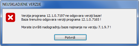 Program će vas samo obavestiti o tekućoj varijanti baze i programa i varijanti koju trebate instalirati da biste nastavili sa radom i ponuditi usklađivanje (vidi sliku)Važno