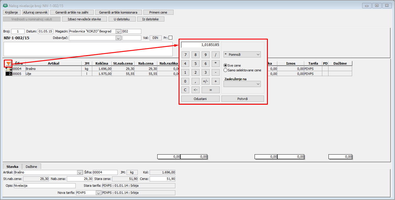 Množenje cene sa koeficijentom uvećanja cene iz nivelacije možemo napraviti novi cenovnik tako što ćemo kliknuti na dugme "