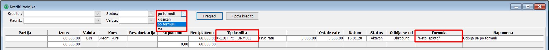 Evidencija kredita po formuli