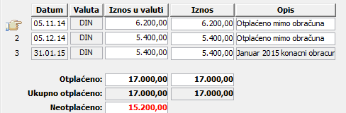 U editoru ovog prozora opciono se unose datumi i iznosi isplata po ratama koje je zaposleni već otplatio na neki drugi način, npr. iz radnog odnosa u drugoj firmi, organizacionoj jedinici preduzeća i slično. Unesite sve već otplaćene rate kredita do aktuelnog datuma za otplatu prve sledeće ne otplaćene rate ( vidi sliku )