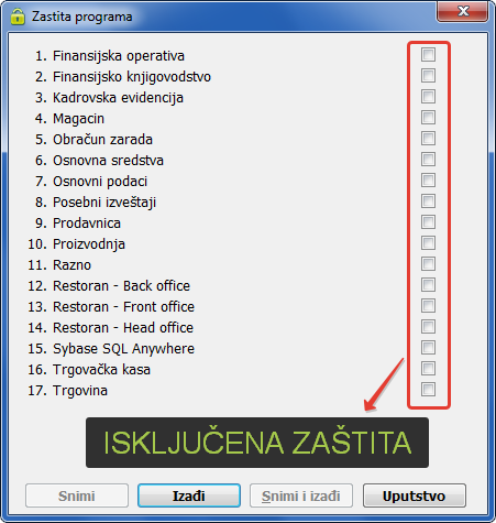 Zaštita se podešava na nivou svakog programa i svake baze podataka. Da biste podesili zaštitu ako imate više instaliranih baza podataka, morate ući u ovaj program za svaku bazu posebno i uraditi podešavanja. Npr. možete imati jednu bazu samo radi vežbe ili eksperimentisanja sa podacima, pa vam na njoj nije potrebna zaštita, i jednu "pravu" bazu, na kojoj želite da uključite zaštitu. Dugmetom "Snimi" obavezno potvrdite podešavanja koja ste izvršili kako bi bila upamćena.